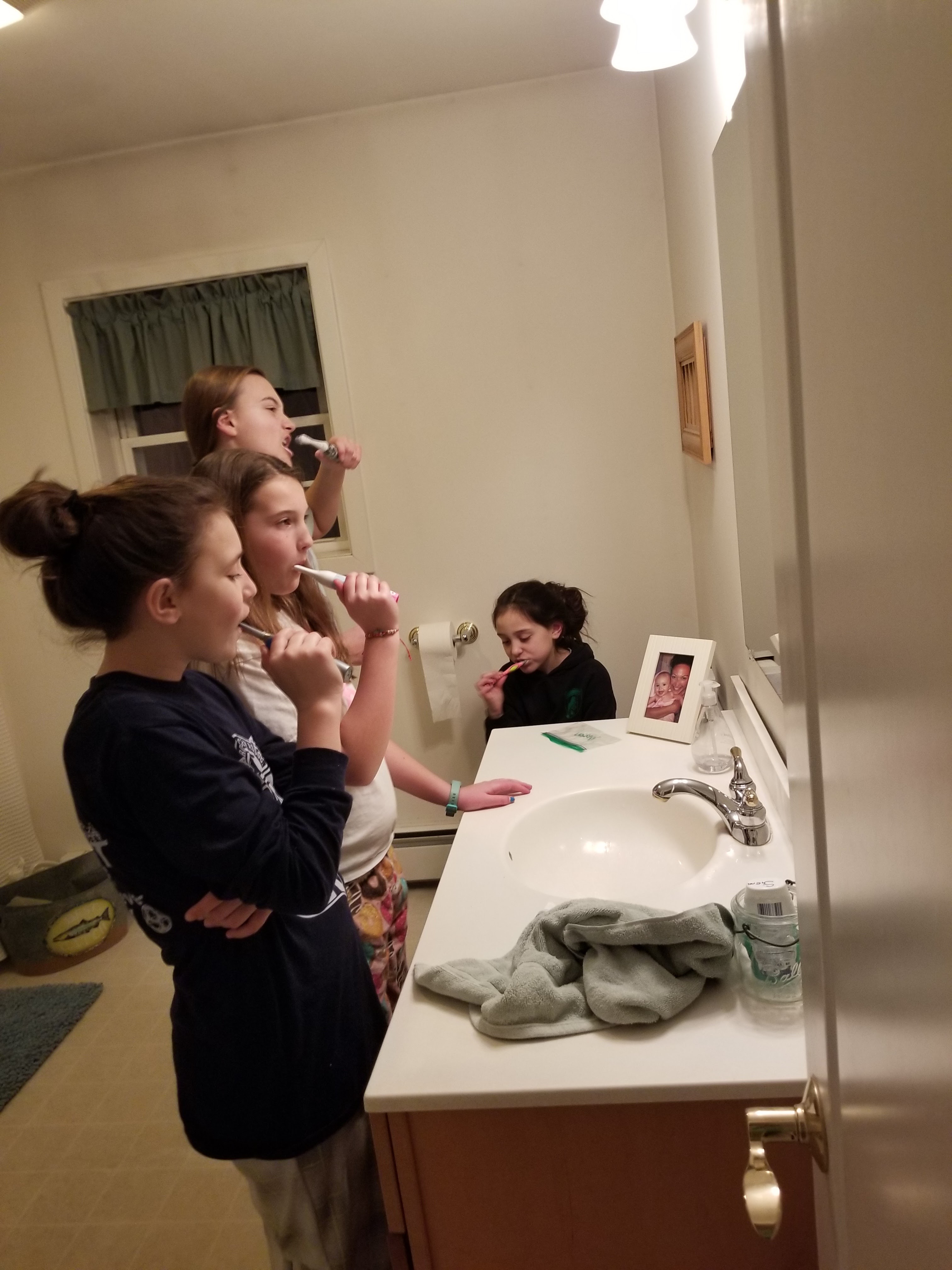 On Friday we FINALLY managed to get BOTH Penney gals to sleepover... and no she's not going potty there's just no more room at the sink.....