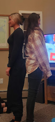 Sunday after church we cleaned the house, welcomed Daddy HOME and got ready for the R crew to hang for the Super Bowl. We HAD to measure it up... yep... they are the same or perhaps Minnie is SLIGHTLY taller...